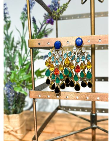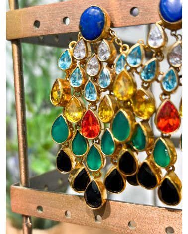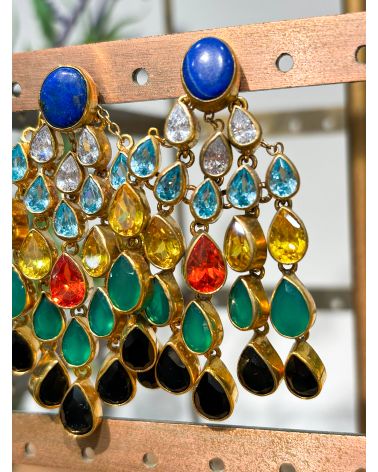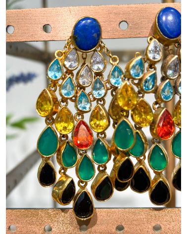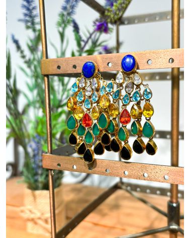 Boucles d'oreilles à clip en laiton et onyx vert, onyx noir, aquamarine bleue, et cristal.