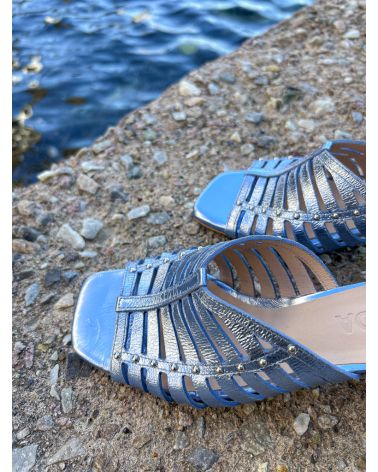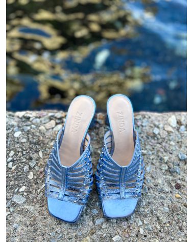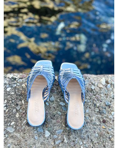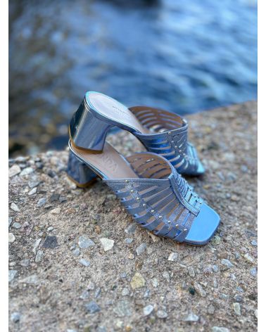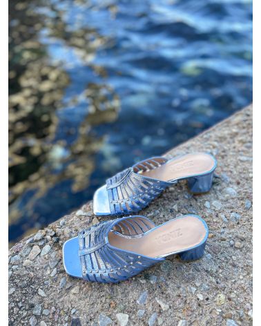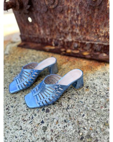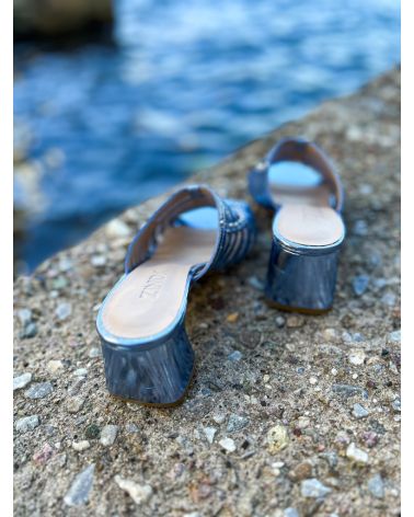 Mules à talon recouvert en cuir métallisé bleu océan , avec des reflets lamés sur le talon et la semelle. L'avant de la chaussure présente de nombreuses lanières imbriquées qui épousent lea forme du pied , parsemées de petits rivets ronds argent. Cuirs et confort exceptionnel.
