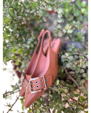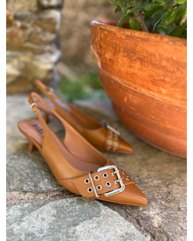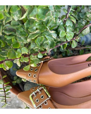 Escarpins en cuir cognac, talon bobine et boucle décorative sur l'avant. Cuir ultra souple, modèle confort avec semelle intérieure effet coussin.