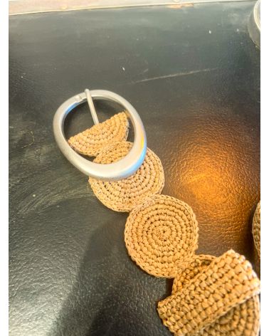 Ceinture en crochet de raphia avec une succession de formes circulaires tressées entre elles et une boucle ovale en laiton argenté vieilli / épaisseur 5cms. existe en camel : plus foncé et en beige: plus clair.
