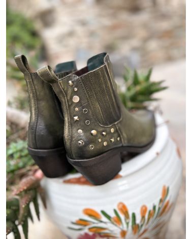 Bottines type saintiags avec bout pointu et talon incurvé en cuir vieilli Kaki , avec rivets métal or et argent de différentes tailles et double soufflet recouvert de cuir. Cette marque est reputée pour la souplesse de ses cuirs lavés, brossés et le confort de ses chaussures .