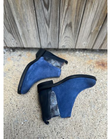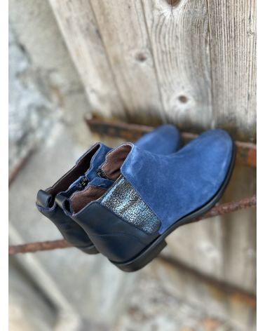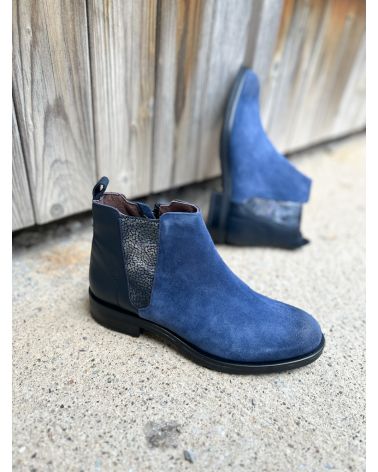 Bottines type chelsea en croute bleue sur l'avant , et cuir lisse bleu marine sur l'arrière . zip àl'intérieur , et soufflet imprimé cuir sur le côté.Grand confort.