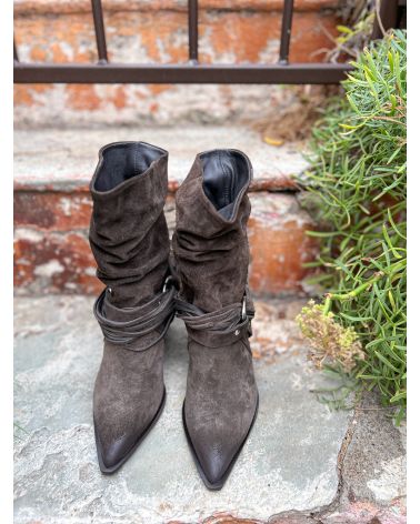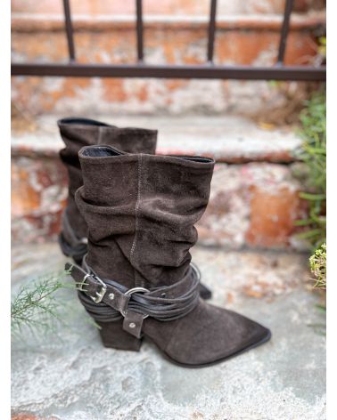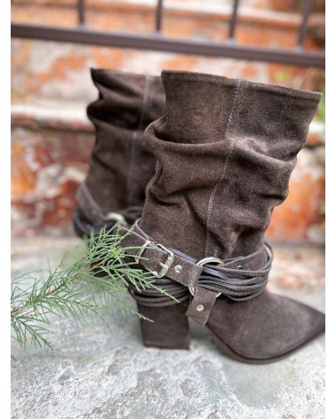 Bottines semi-hautes en nubuck taupe marron doublé de cuir lisse avec plusieurs sangles plates fines entrelacées dans ce qui se rapproche d'une boucle de bottines cavalières.