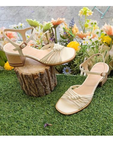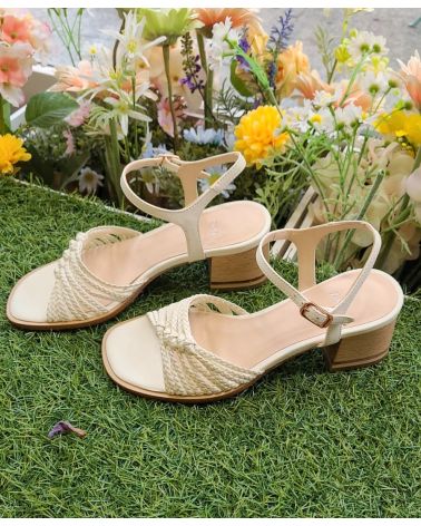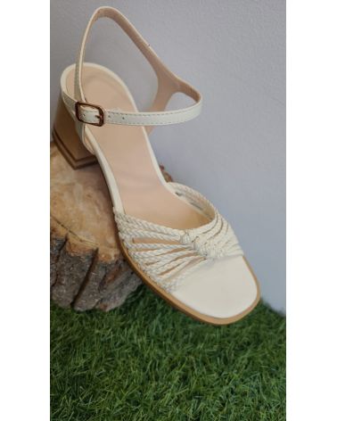 sandale talon carré, et cuir tressé crème. grand confort. ressérré sur l'avant.chaussant très grand.