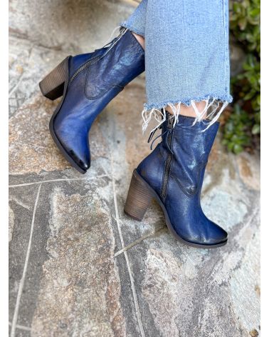 Bottine type santiag avec talon incurvé en cuir bleu jean brossé pour un effet vintage. Grand confort