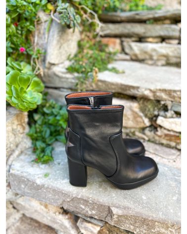 Bottine talon bloc avec plateforme sur l'avant de 2 cms, pour un confort maximum . La bottine en cuir lisse noir, présente un zip intérieur et une croix en cuir argent grisé sur l'arrière, et un vent rebondi semi carré.
