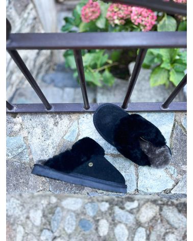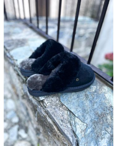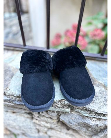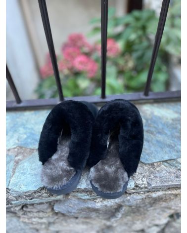 Chausson en mouton retourné véritable de couleur noir sur le dessus avec semelle intérieure en mouton taupe.