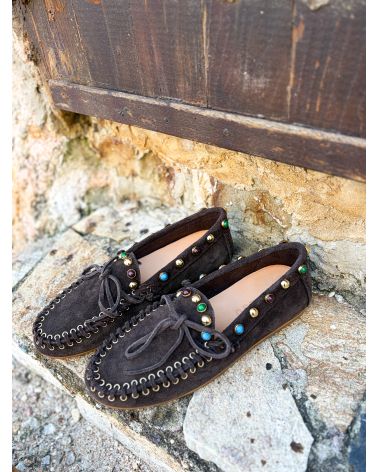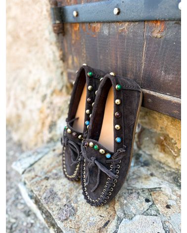 Mocassins d'inspiration indien en nubuck ultra souple avec des perles de couleur. Grand confort.