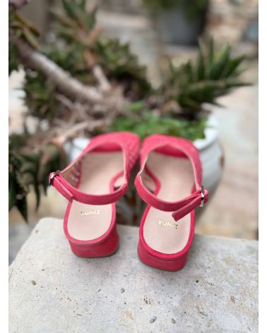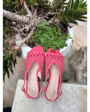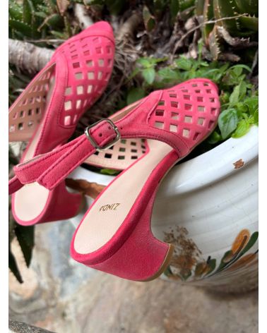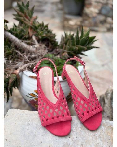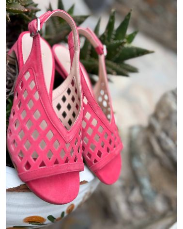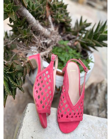 Sandales petit talon original , carré sur l'arrière mais fin de profil , en nubuck rose . Grand confort et effet retro chic garanti.