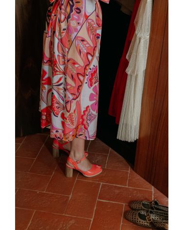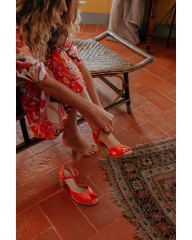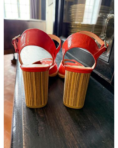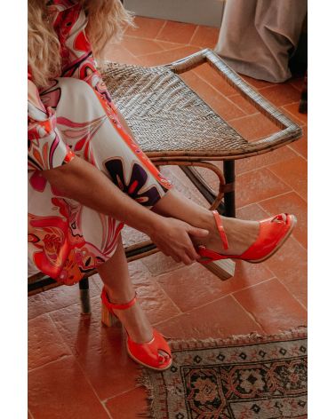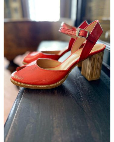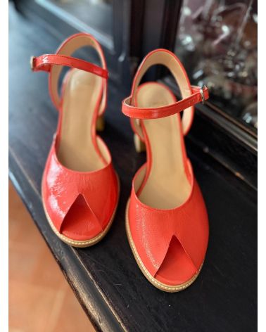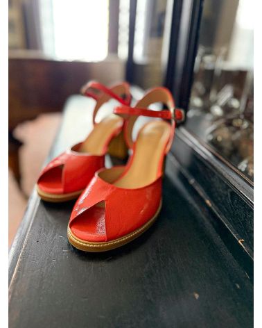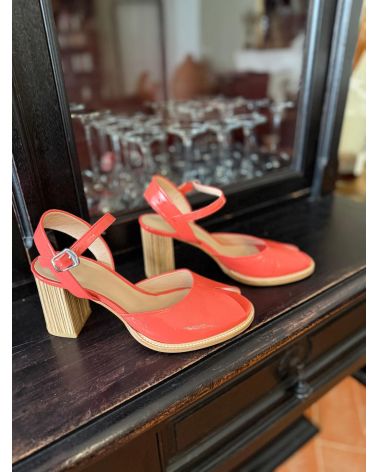 Sandales en cuir verni rose saumoné , de forme retro avec un open toe découpé en triangle. Le talon est recouvert de bandes de cuir , simulant l'effet du bois. la semelle d'usure est cousu sur le débordement avant pour des finitions soignées. Modèle unique et grand confort.