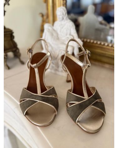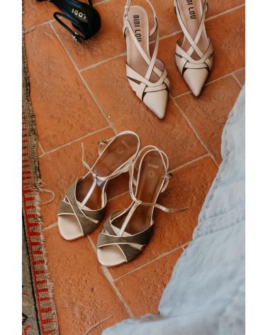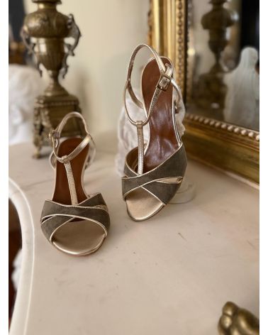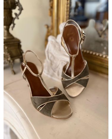 Sandales grand confort en cuir ultra souple et très légères, en nubuck kaki et cuir métallisé champagne avec talon recouvert pour plus d'élégance. Les lignes croisées à l'avant structurent le pied avec finesse tandis que la bride ajustable et la talon légèrement évasé à la base apportent maintien et élégance.