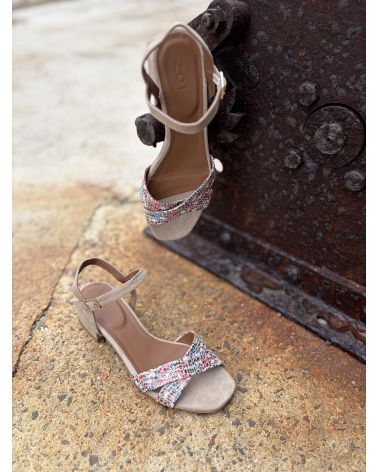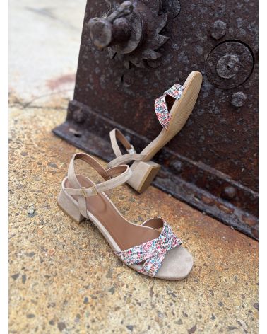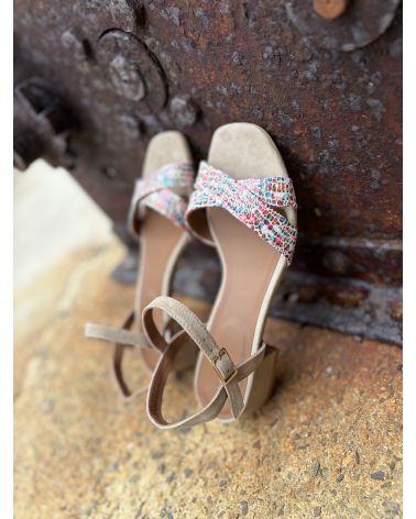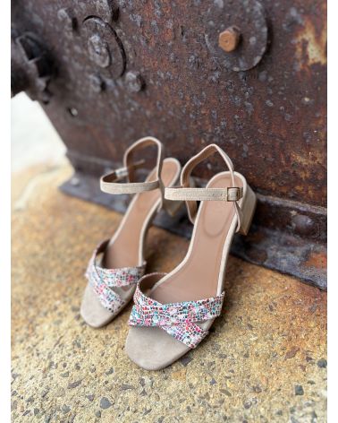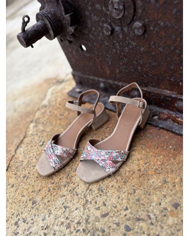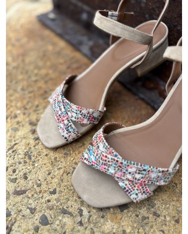 Touche originale et girly pour cette sandale en suédine gris taupe et cuir imprimé de taches multicolores. Grand confort
