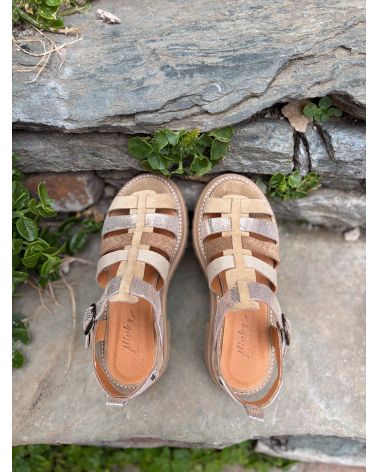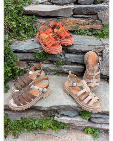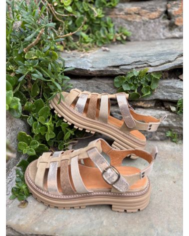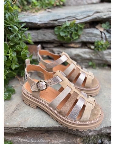 Sandales semelle crantée avec 4 brides de cuirs différents : métal doré, marron clair texturé, argent à effet , et nubuck beige. De nombreux details aussi comme les coutures sur la semelle ou le nubuck autour de la semelle, font de ce modele un exemple de design et confort.